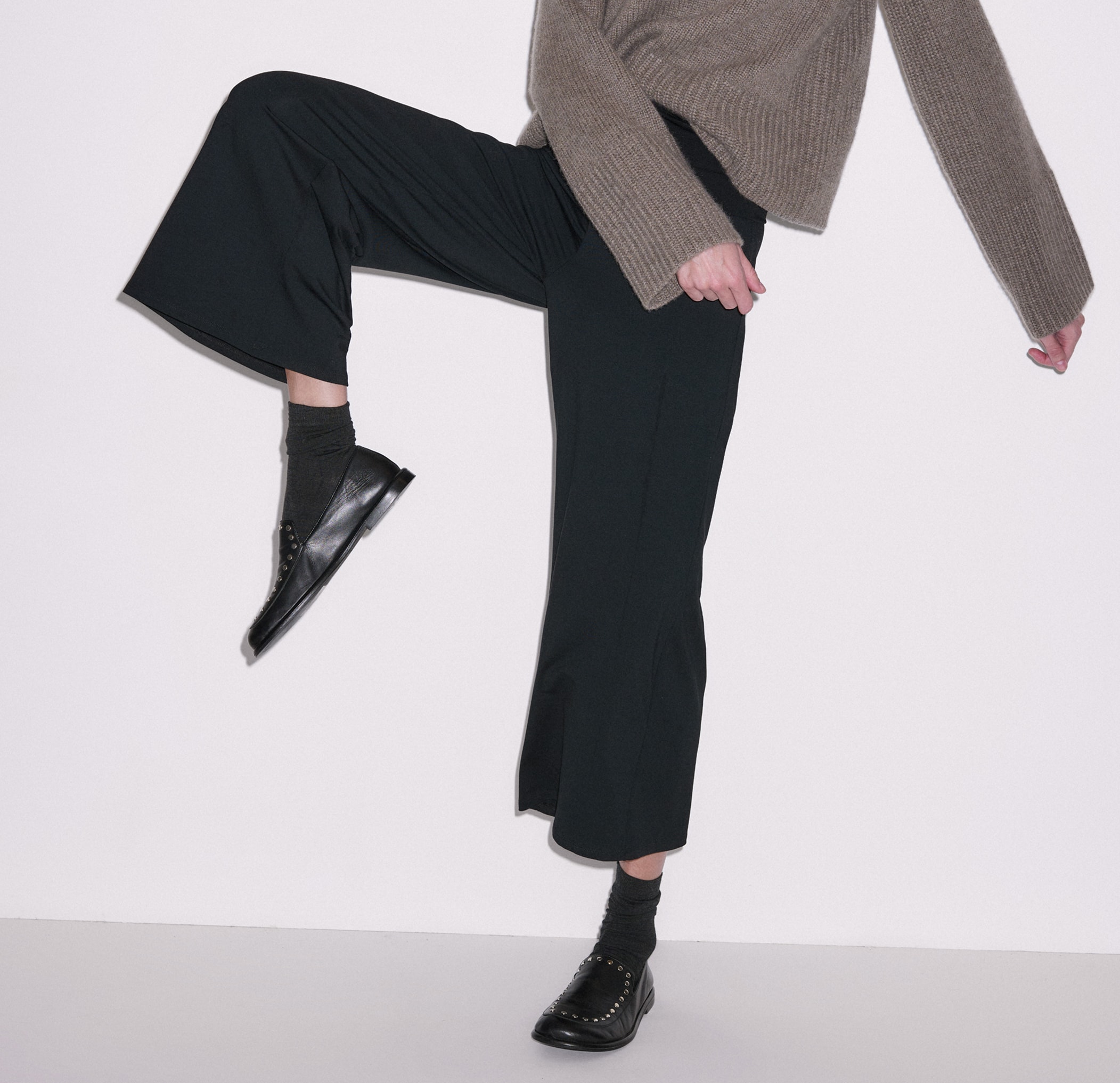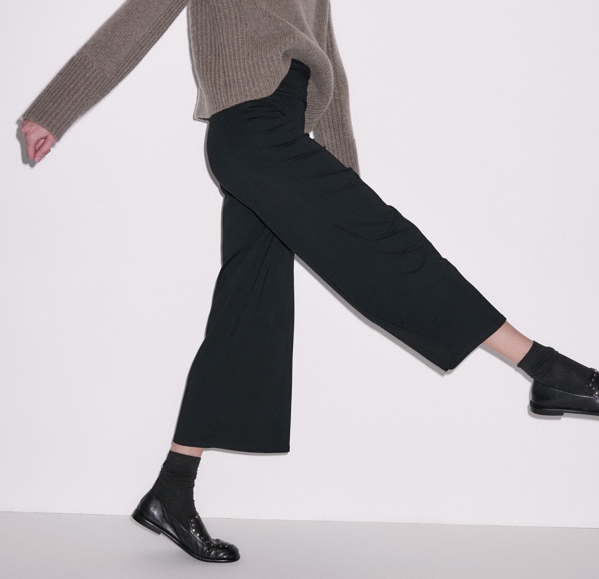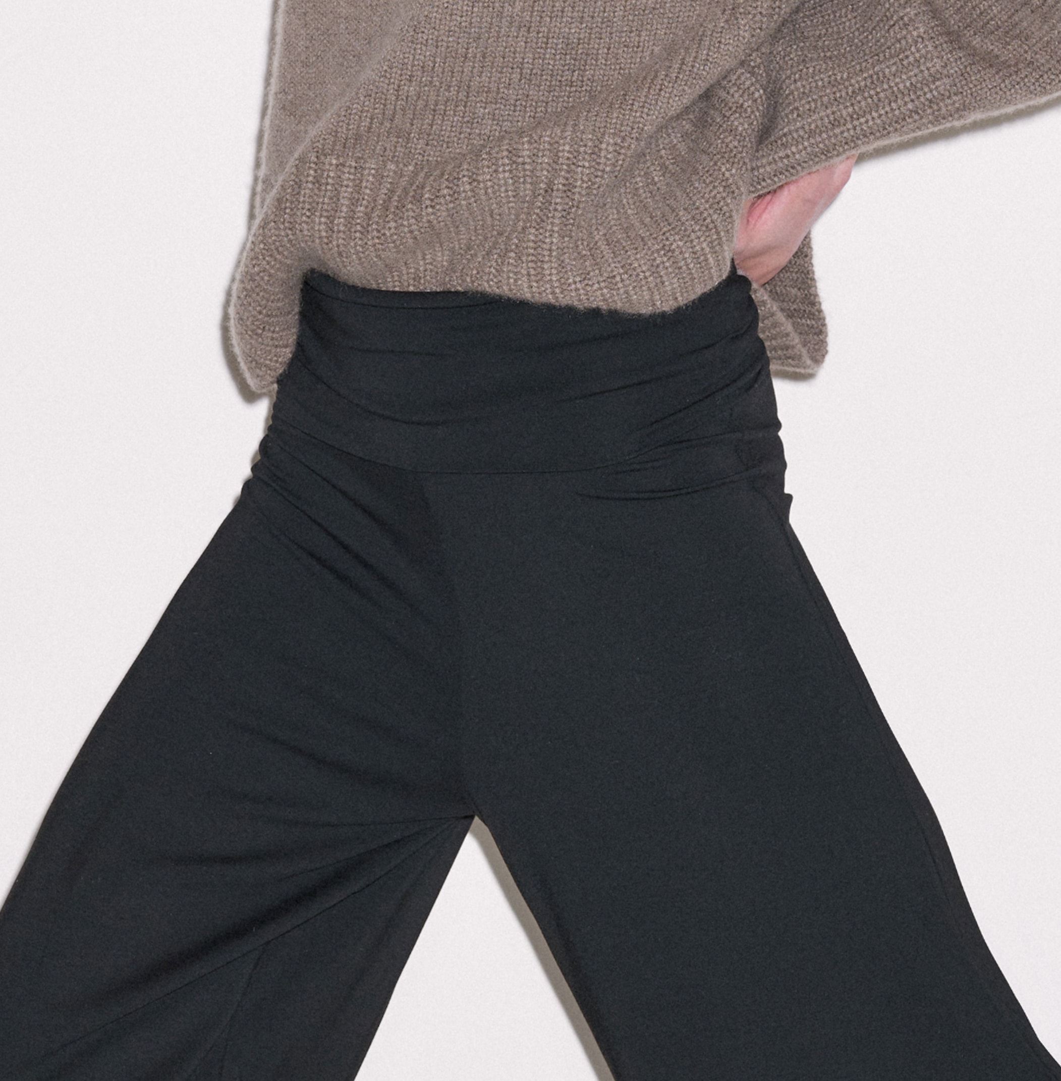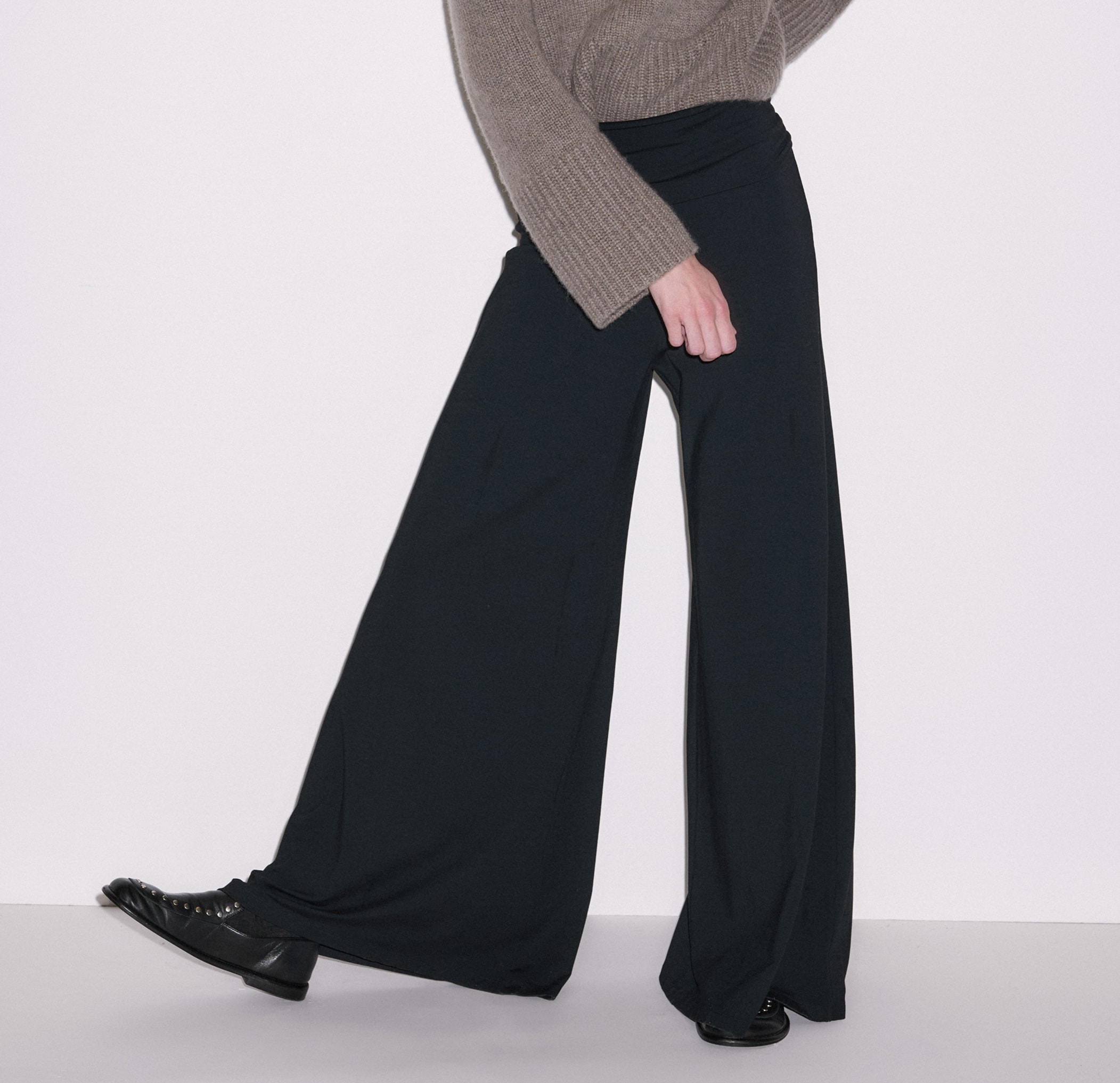 The Palazzo Pant is getting a new-season refresh. As well as the original silhouette, we’ve developed a new shape: the super-wide leg. Crafted from the same ultra-soft jersey with the same fold-over adjustable waistband, we’ve chosen a wider cut through the leg to give this pair an evening-ready edge. The choice of Black, Navy or Warm Chocolate is specifically chosen to work as a versatile base alongside the neutrals + brights throughout the winter collections.